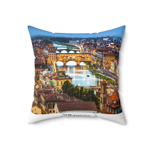 Warm dusk settles over a river city, the terracotta roofs and arched bridges glowing with amber light. This spun polyester square pillow brings that skyline into your living room — soft to the touch, vivid in color, and built to hold its shape.
