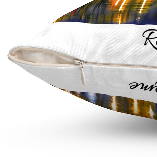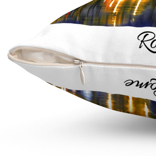 Soft, square throw pillow printed on both sides with a glowing nightscape of a historic European city reflected in river waters. The spun polyester cover holds crisp color and resists wrinkles, while a generous recycled-poly insert (shipped separately) gives the cushion a plump, full look when assembled.